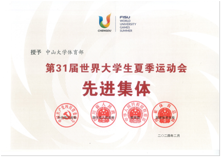 中大新闻网讯(通讯员田青)经党中央、国务院批准,中共四川省委、四川省人民政府、教育部、国家体育总局联合表彰一批在第31届世界大学生夏季运动会申办、筹备、举办工作中作出突出贡献的集体和个人,我校体育部荣获“第31届世界大学生夏季运动会先进集体”。