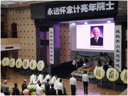 告别厅内庄严肃穆,明净素雅,花圈环抱,大屏幕上展示着计亮年院士的生平点滴,对所有追思者而言老先生的音容笑貌仍历历在目。计亮年院士的遗体安放在鲜花丛中,夫人和子女及一众亲友家属的花圈安放在他的遗体旁,挽联横幅上写着“永远怀念计亮年院士”。