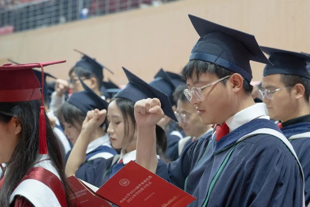 “百年校庆是全体中大人的节日。今年以来,我们一起见证了林斌刘向东校友伉俪捐资支持母校建设、庞红亮校友登顶珠峰向母校送上生日祝福、男子排球队在中国大学生排球联赛中荣获普通本科组和高水平组‘双冠王’等喜悦时刻。尤为欣喜的是,我们一起见证了在座各位学业有成,即将开启人生的新篇章!我想,中大人的努力、拼搏和奉献就是我们对学校百年的最好庆祝。”高松校长以“世纪中大,山高水长”的百年校庆主题勉励全体毕业生:中大“山高水长”是我们共同的追求,需要中大人的共同努力。站在新的历史起点上,学校凝心聚力“再出发”。各位同学即将毕业,每个人也面临着“再出发”。他希望2024届毕业生,作为学校新百年的第一批校友,“要做爱国而务实的中大人,矢志报效国家;要做理性而开放的中大人,积极改变世界;要做独立而担当的中大人,努力引领未来。”