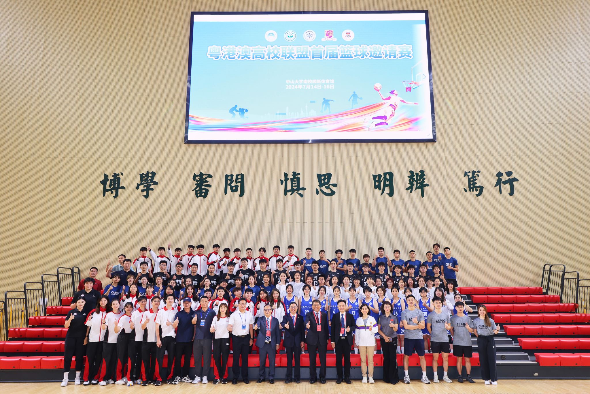 粤港澳高校联盟首届篮球邀请赛上,四所创盟高校领导与参赛队员合影