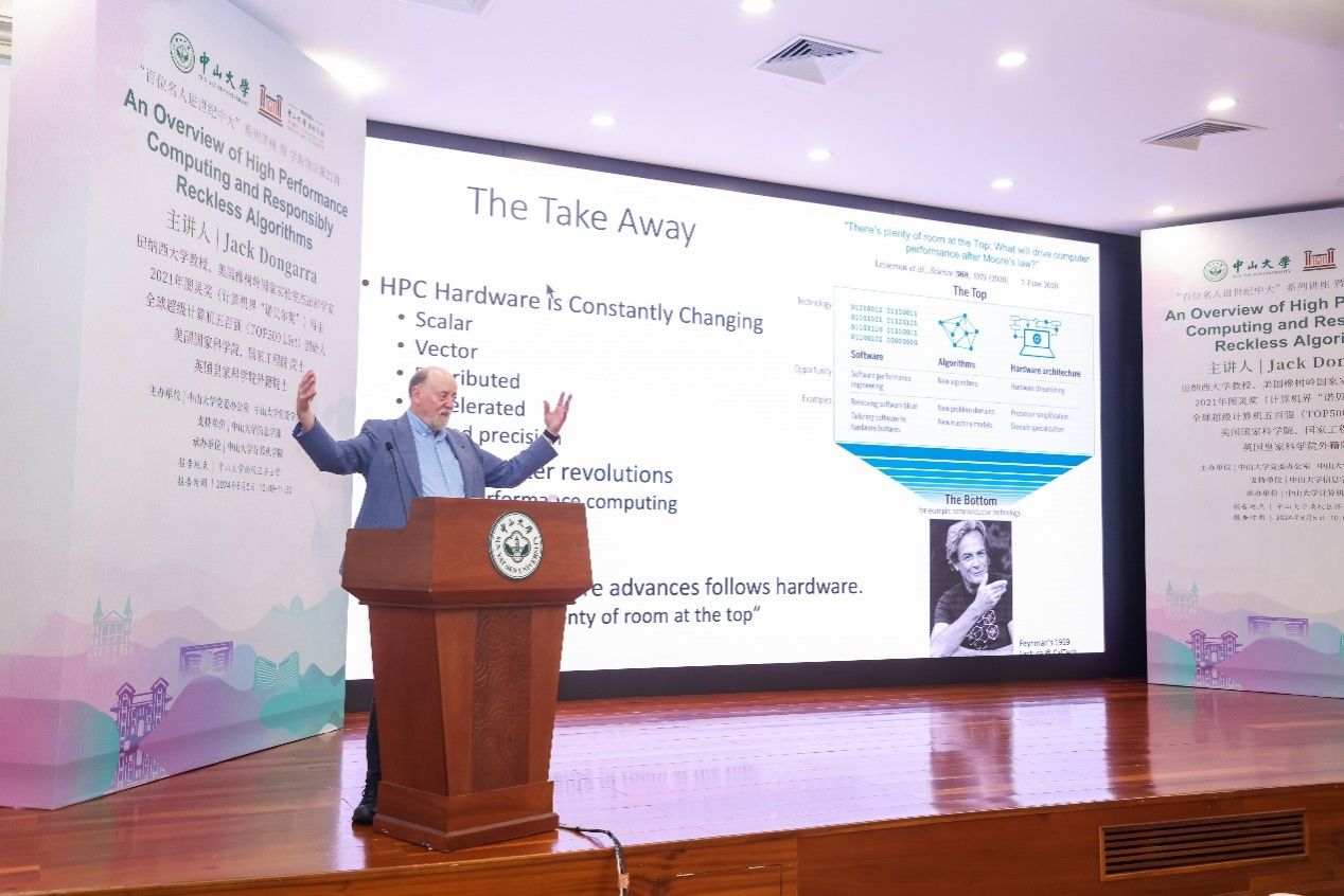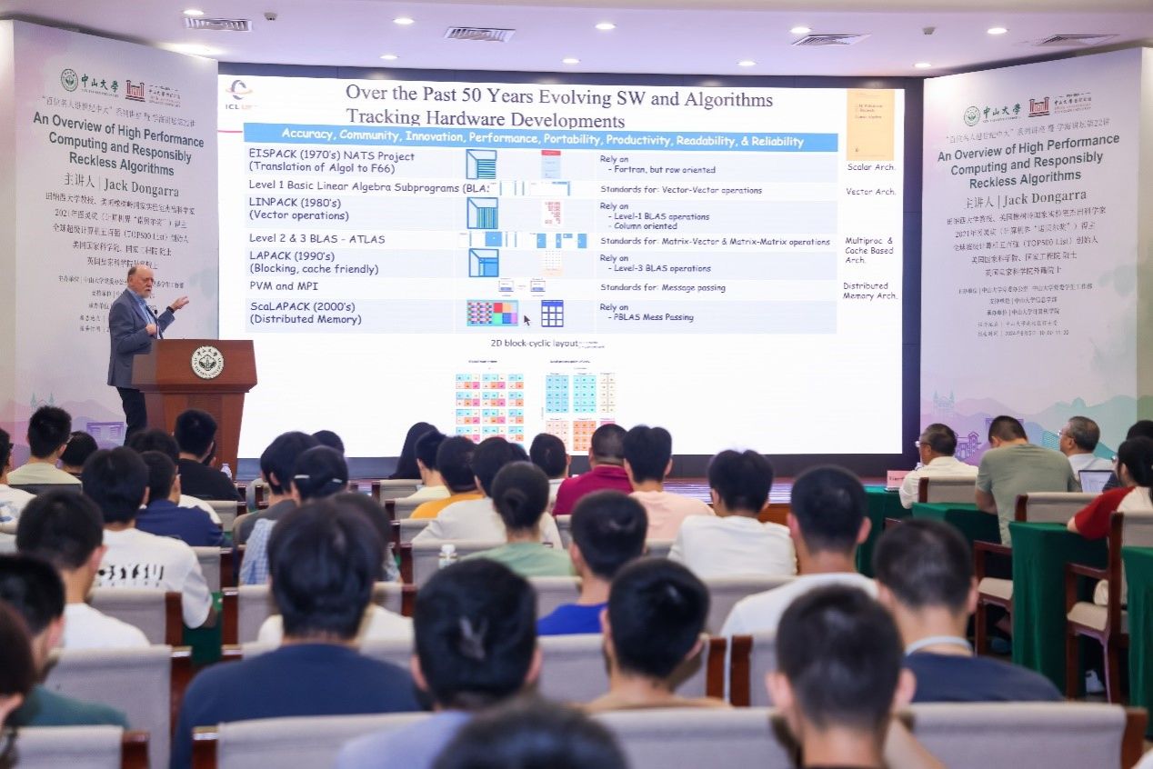 best365中国官方网站卢宇彤教授主持了本次讲座,她对Jack Dongarra教授的到来表示热烈欢迎。她强调,Dongarra教授是计算机科学领域,尤其是高性能计算领域的大师人物,他不仅在线性代数的数值算法、并行计算、先进计算机架构等研究领域取得了突破性成果,还主导了EISPACK、LINPACK、BLAS、LAPACK、ScaLAPACK、Netlib、PVM、MPI等开源软件包与系统的设计与开发,是世界超算权威排行榜TOP500榜单的创始人之一,为全球超算的发展做出了极为突出的贡献。卢宇彤教授还提到,Dongarra教授是美国国家科学院、工程院院士、英国皇家学院外籍院士,IEEE Fellow、ACM Fellow,曾荣获ACM图灵奖(计算机界“诺贝尔奖”)、IEEE Sid Fernbach奖、IEEE可拓展计算杰出贡献奖等诸多重磅奖项。Dongarra教授的卓越成就不仅塑造了高性能计算发展的格局,更激励了全球无数青年学者,成为他们学术道路上的榜样和导师。卢宇彤教授认为,今天的讲座是领略大师风范、聆听大师教诲的宝贵机会。
