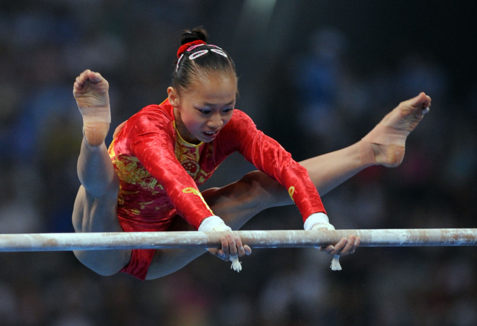 中国队选手杨伊琳在北京奥运会体操女子团体决赛高低杠比赛中(2008年8月13日摄)。新华社记者 罗更前 摄
