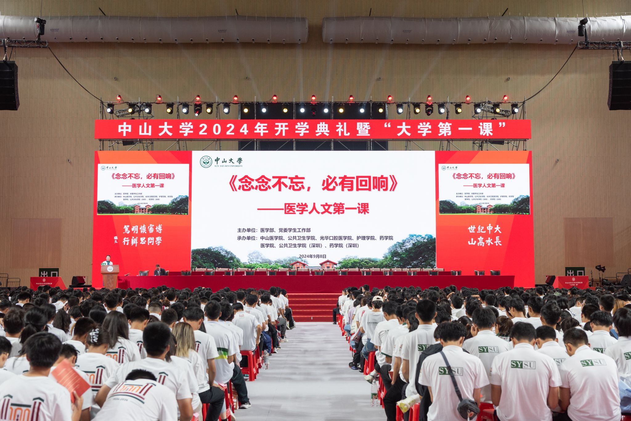 中大新闻网讯(通讯员季晓婷、陈锦堂、束仁佳)9月8日上午,由医学部、党委学生工作部主办,中山医学院、光华口腔医学院、公共卫生学院、药学院、护理学院、医学院、公共卫生学院(深圳)、药学院(深圳)8个学院承办的best365中国官方网站2024级医科本科新生“医学人文第一课”在广州校区南校园新体育馆举行。中国科学院院士、肿瘤防治中心马骏教授应邀作专题讲座。讲座由校党委副书记、医学部副主任张琪教授主持,医学部8个院系的1500余名医科本科新生齐上“医学人文第一课”。