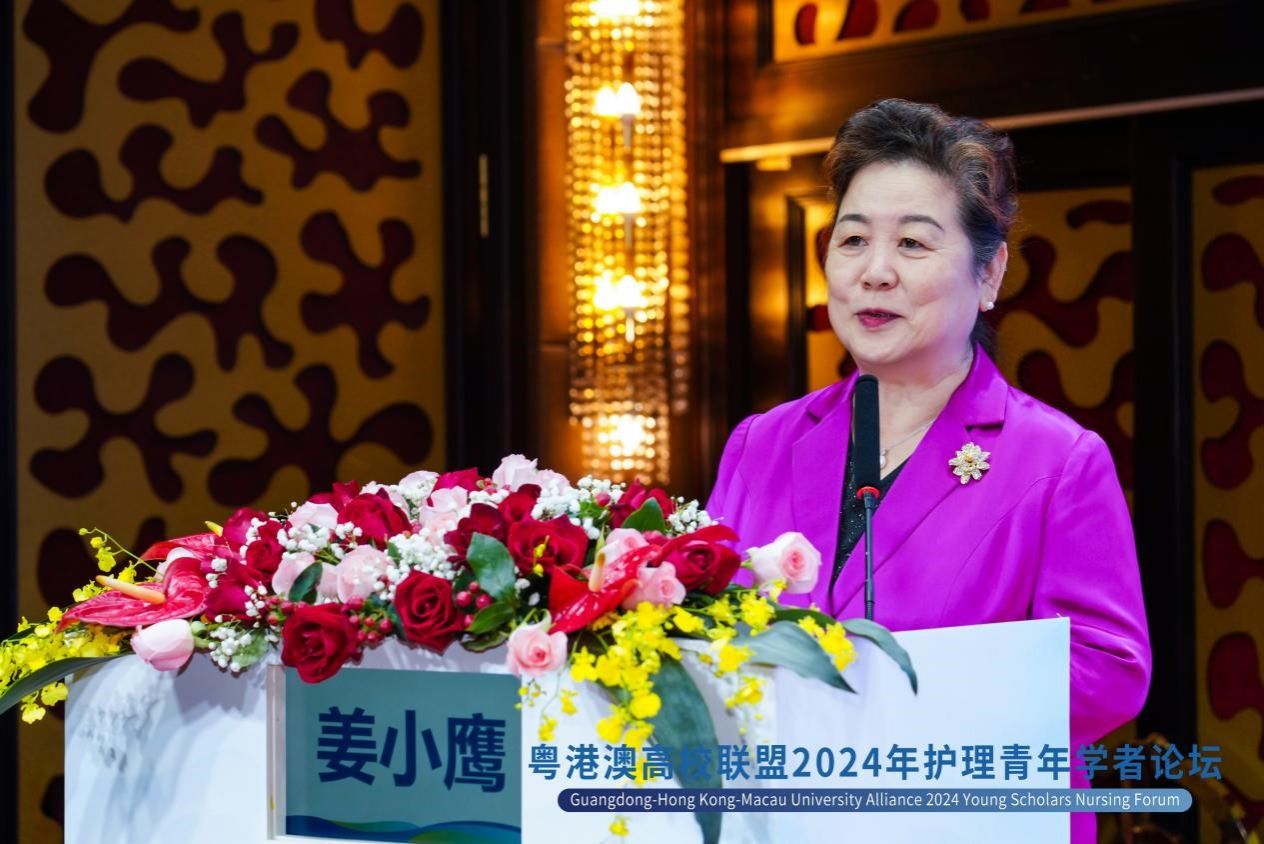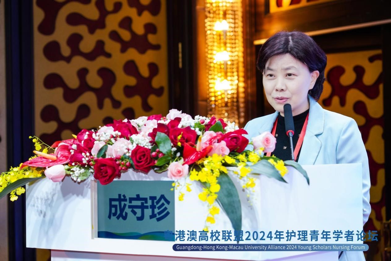 黄金月教授在致辞中提到,粤港澳高校护理联盟成立的目的是汇聚粤港澳三地护理领域力量,促进三地交流。她表示,希望通过科研合作,把前沿的医疗护理发展理念和临床实践交叉融合,为患者提供更优质的医疗服务。她鼓励粤港澳三地青年学者充分利用本次论坛机会,加强交流与合作,为护理学科创新发展贡献力量。