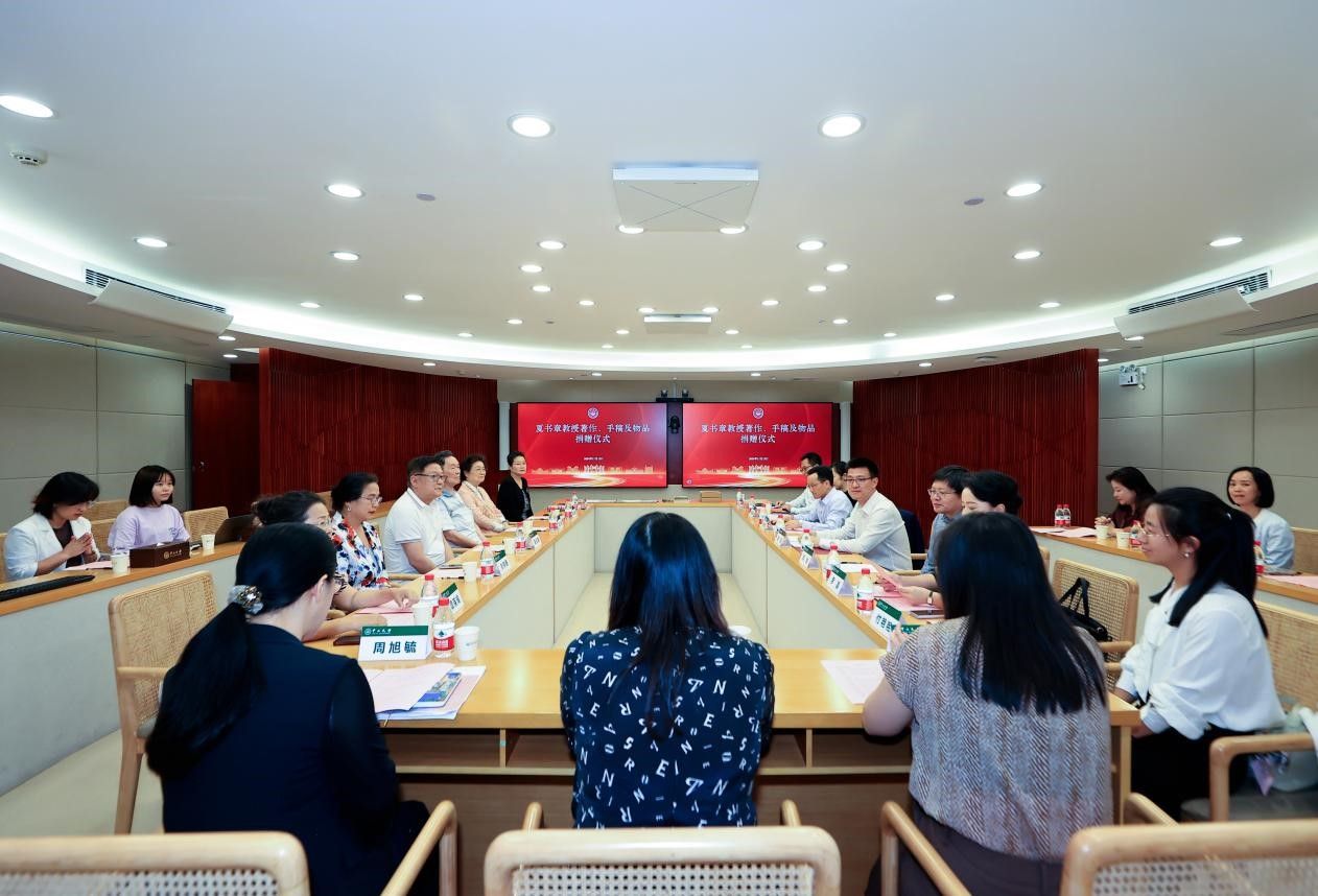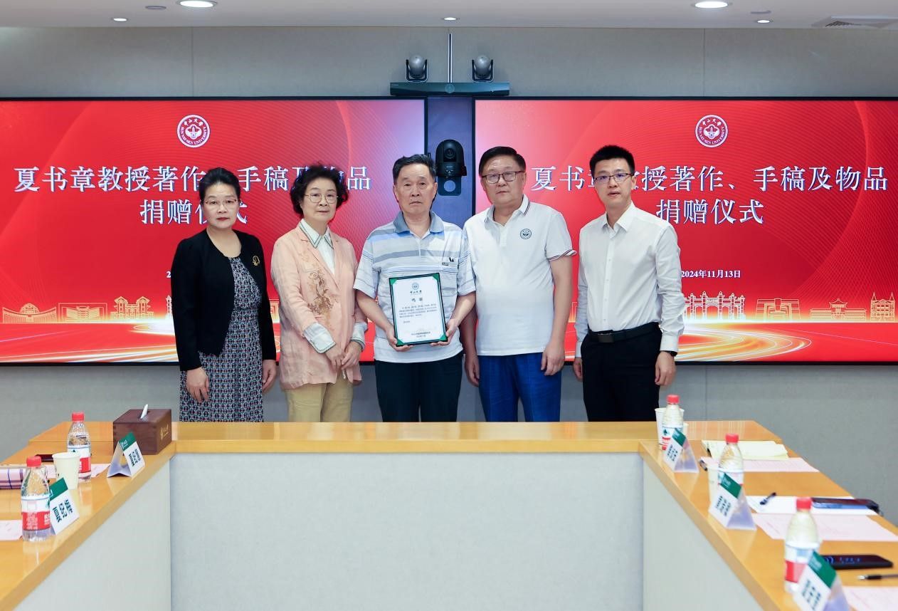 档案馆、博物馆、图书馆负责人代表学校接受捐赠,谢湜副校长向夏老子女颁授鸣谢证书。