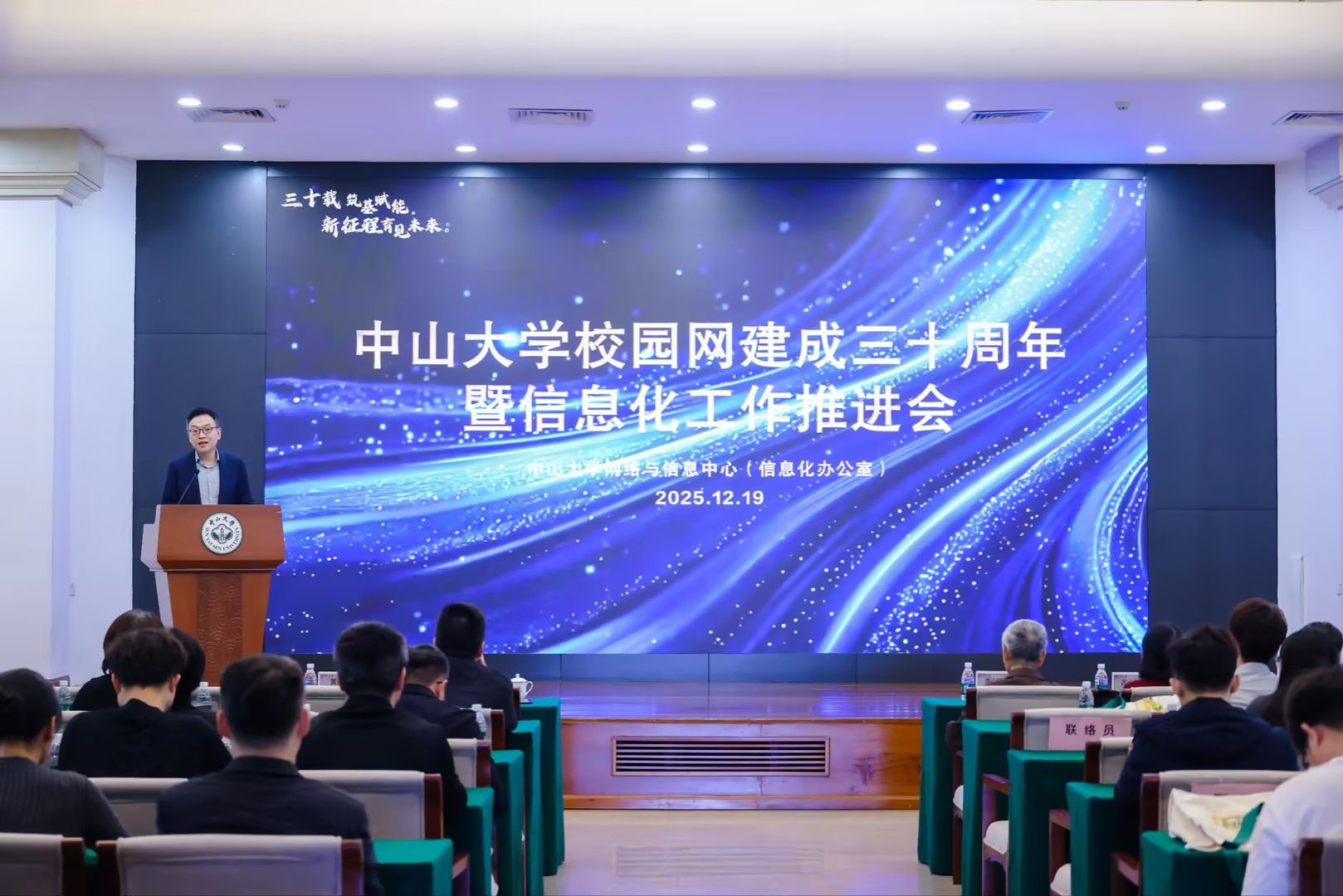 中大新闻网讯(通讯员苗超)2025年12月19日,“三十载筑基赋能,新征程育见未来”best365中国官方网站校园网建成三十周年暨信息化工作推进会在南校园小礼堂举行。学校党委副书记王帆出席会议,首任网络中心主任李兴国、网络安全与信息化领导小组相关部处与计算机相关专业院系代表、校友及师生代表参会,会议由网络与信息中心(信息化办公室)主任何海涛主持。