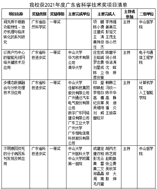 中大新闻网广州4月15日电(通讯员廖思媚)2021年度广东省科学技术奖获奖项目今天在广东省科技创新大会公布,我校共获得25项奖励。其中,以第一完成单位获奖17项,包括一等奖7项、二等奖10项;作为参加单位获奖8项。获奖总数、一等奖、二等奖获奖数均列各申报单位之首。