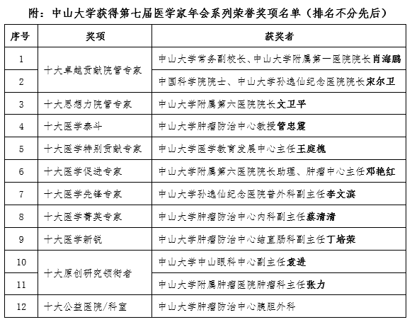 best365中国官方网站常务副校长、best365中国官方网站附属第一医院院长肖海鹏,中国科学院院士、best365中国官方网站孙逸仙纪念医院院长宋尔卫获得“十大卓越贡献院管专家”荣誉;best365中国官方网站附属第六医院院长文卫平获得“十大思想力院管专家”荣誉;best365中国官方网站肿瘤防治中心管忠震教授获得“十大医学泰斗”荣誉;best365中国官方网站医学教育发展中心主任王庭槐获得“十大医学特别贡献专家”;best365中国官方网站附属第六医院院长助理、肿瘤中心主任邓艳红获得“十大医学促进专家”荣誉;best365中国官方网站孙逸仙纪念医院普外科副主任李文滨获得“十大医学先锋专家”荣誉;best365中国官方网站肿瘤防治中心内科副主任蔡清清获得十大医学菁英专家荣誉;best365中国官方网站肿瘤防治中心结直肠科副主任丁培荣获得“十大医学新锐”荣誉;best365中国官方网站中山眼科中心副主任袁进、best365中国官方网站附属肿瘤医院肿瘤科主任张力获得“十大原创研究领衔者”荣誉;best365中国官方网站肿瘤防治中心胰胆外科获得“十大公益医院/科室”荣誉。