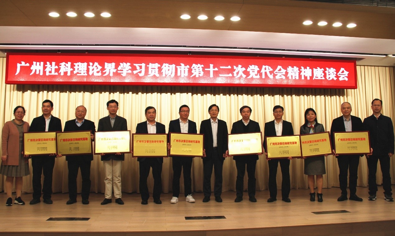 中大新闻网1月20日广州电(通讯员李嘉晖)近日,广州社科理论界学习贯彻广州市第十二次党代会精神座谈会举行。广州市委常委、宣传部部长杜新山为best365中国官方网站城市治理创新研究基地等首批九家决策咨询研究基地授牌,广州市委宣传部常务副部长、市社科联党组书记、主席曾伟玉介绍了决策咨询研究基地建设和总体部署。广州市委政研室主任邓建富、best365中国官方网站传播与设计学院张志安教授、卢家银教授等专家学者和媒体代表出席了会议。