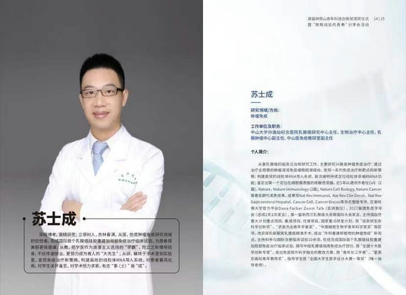 苏士成教授是肿瘤免疫研究领域的佼佼者,完成国际首个乳腺癌硅胶重建加局部免疫治疗临床试验,为患者保美丽更保健康。他在而立之年博导冠身,不仅传道授业,更努力成为育人的“大先生”。他辗转于手术室到实验室,发现免疫治疗新策略,构建高效的线粒体RNA导入系统,对患者春风化雨,对学生关怀备至,对学术努力求索。