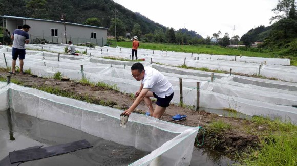 结合柯木湾村交通便利,运输成本低,水源清洁充足的特点,在校友企业荆州市民康生物科技有限公司技术支持下,学校在柯木湾村开展15亩水蛭养殖试点项目,组织贫困户成立专业合作社,通过村集体带动贫困户增收。水蛭养殖是新生事物,从工作队到村民,没人有相关经验,这就需要具体工作人员投入大量的时间精力,随时观察水蛭生长情况,随时处理问题,同时还要承担难以预测的风险。经过反复论证、思考,李晓超给自己制定了工作方针:敢闯敢干,精益求精。他积极向校友企业派出的技术员请教,学习水蛭养殖基本知识,向学校随时反馈养殖进展和问题。同时与村支部沟通协商,组成一线工作小组,让村委会的党员干部担任项目负责人,选派贫困户中的党员代表担任养殖员,高效解决实际问题,带动村党员在攻坚克难中发挥先锋模范作用。水蛭养殖的饲料来源是水螺,按照最初计划,由校友企业大批量从湖北运送,成本低。但很快发现,因长途运输问题,水螺死亡率高,且储存后再投喂,养殖员工作量加大。如果改从本地采购,因本地水螺以食用为主,成本比较高,很难盈利。这个问题不解决,项目面临失败的风险。李晓超和村委会干部四处奔走,在连州周边地区寻求供货源。经过努力,最终找到了稳定的供货渠道,少量多次进货,直接投喂,解决了燃眉之急。