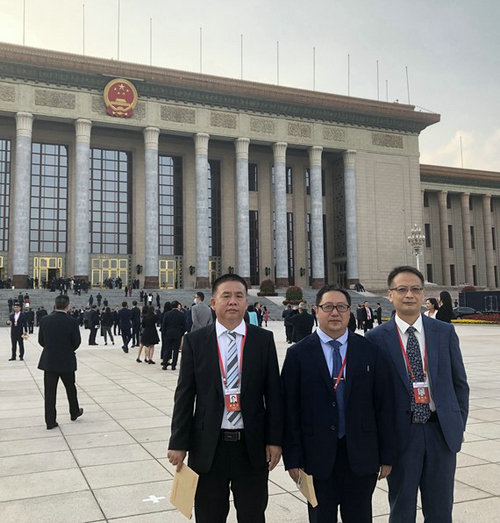 何俊志常务副院长、郭天武副院长、袁旭阳副院长在人民大会堂前合影(来源:粤港澳发展研究院)
