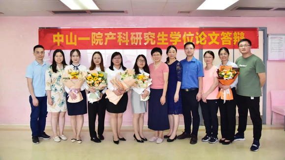 王子莲教授(右六)参加产科研究生学位论文答辩,陈海天副主任医师(右三)和她的研究生(右二)一同参加