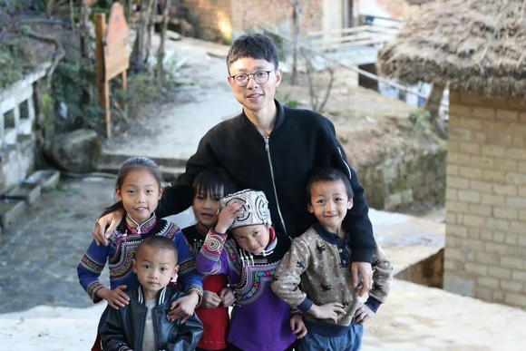 杨兵在阿者科和孩子们合照(来源:旅游学院)