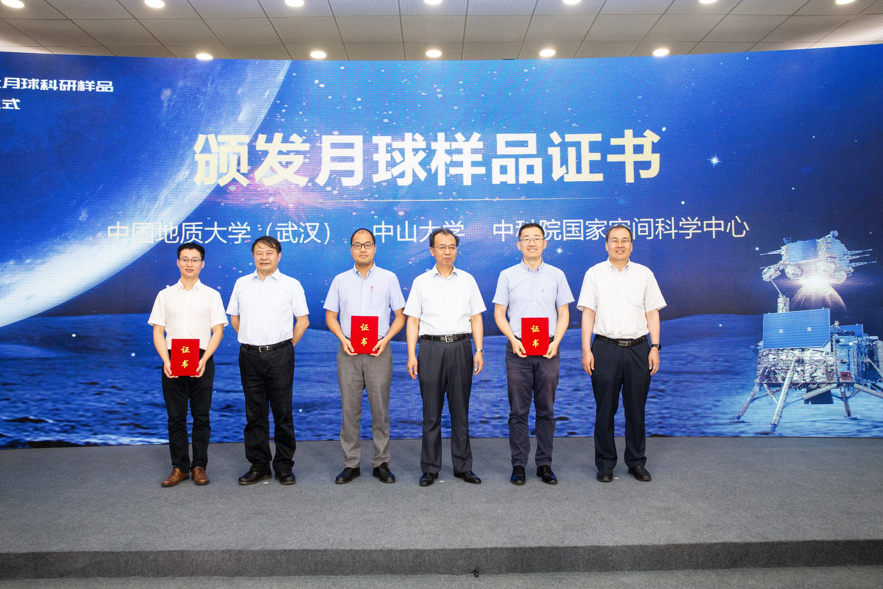 肖智勇副教授(左3)代表我校领取月球样品证书(来源:大气科学学院)