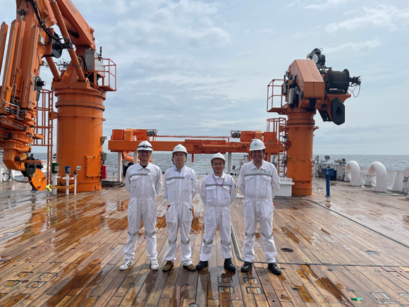 杨日魁(左二)与南方海洋实验室(珠海)李健乐(左一)、常景龙(右二)、鞠家辉(右一)在“best365中国官方网站”号上工作