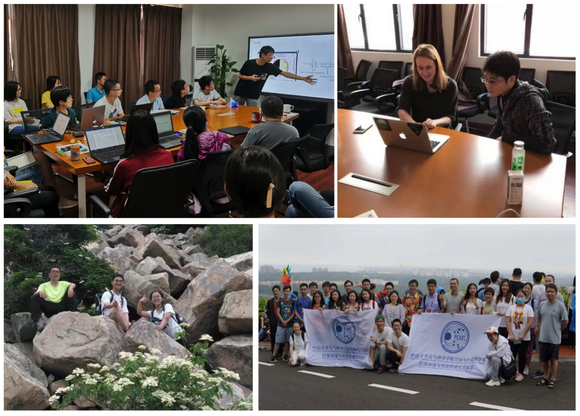 左上:学生自发组织学术研讨会;右上:欧美学者来访并指导学生科研实习;