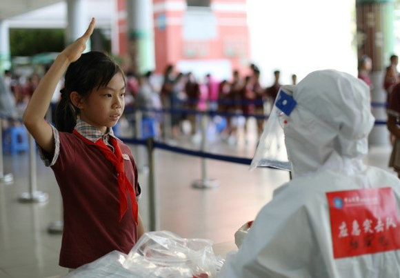 “完全没有想到,太感动了!”6月9日,在珠海市香洲区第十七小学核酸筛查现场,同学们通过歌唱、舞蹈向附属第五医院医务人员致敬,稚嫩的童声和标准的少先队队礼让现场的医务人员备受感动和鼓舞。该校相关负责人表示:“这不仅是核酸采样现场,还是生动的立德树人课堂。”