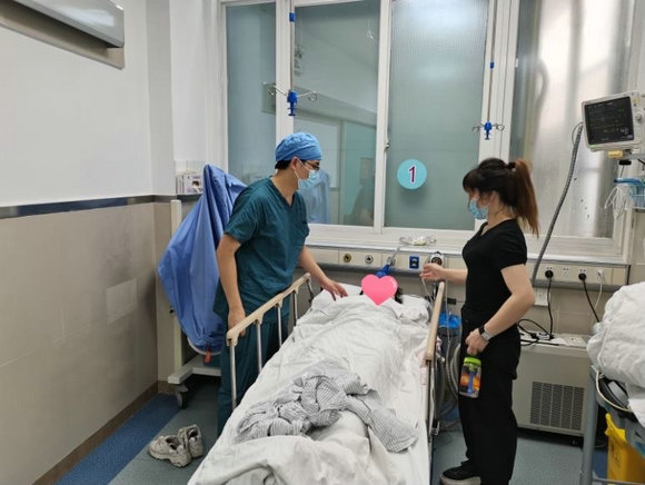 郭明炎(左)陪同吴女士到急诊科就诊(来源:孙逸仙纪念医院)