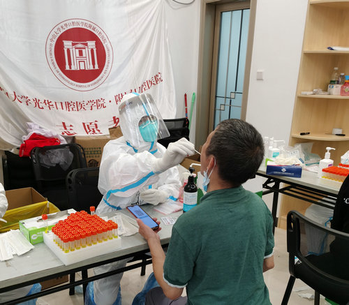 李志鹏为居民做核酸采样(来源:附属口腔医院)