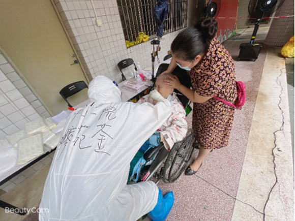 廖苑荃弯腰90度给坐着轮椅的老奶奶采集鼻拭子(来源:附属第一医院)