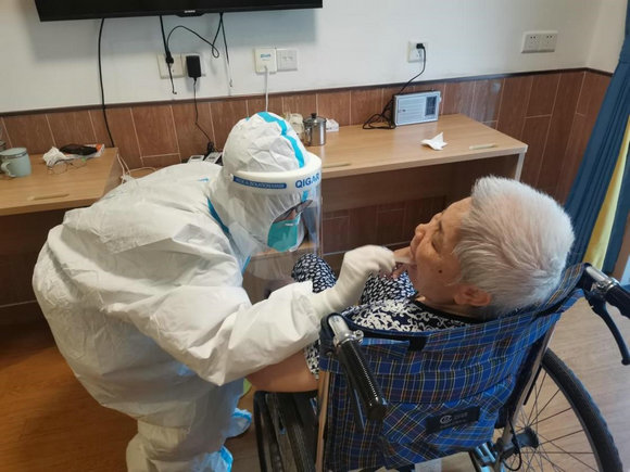 养老院一共五层楼,队员们便一层一层楼、一间一间房为卧床的老人采样,“老人家行动不便,张嘴也存在一定的困难,有的甚至像小孩子一样需要我们不断安抚,部分老人需要与护工配合才能成功采样。这跟在采集点采集核酸很不一样,要更加耐心细致地去引导。”最终,潘英华、王斌雲、杜金英三人克服困难,在5个小时内完成了养老院300名老人的核酸采样任务。尽管汗水早就浸湿了她们的衣衫,她们却说:“作为医护人员,被需要让我们很有成就感!”