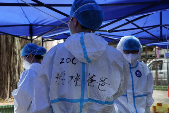 31日一早,申涛又投入到天河区的核酸采样工作中,并让队友在自己的防护服上写上“樱桃爸爸”,身后有了樱桃小宝等家人们的支持,浑身仿佛有使不完的力量。6月1日,ZOC核酸采样志愿者队伍里又出现了“樱桃爸爸”的身影……