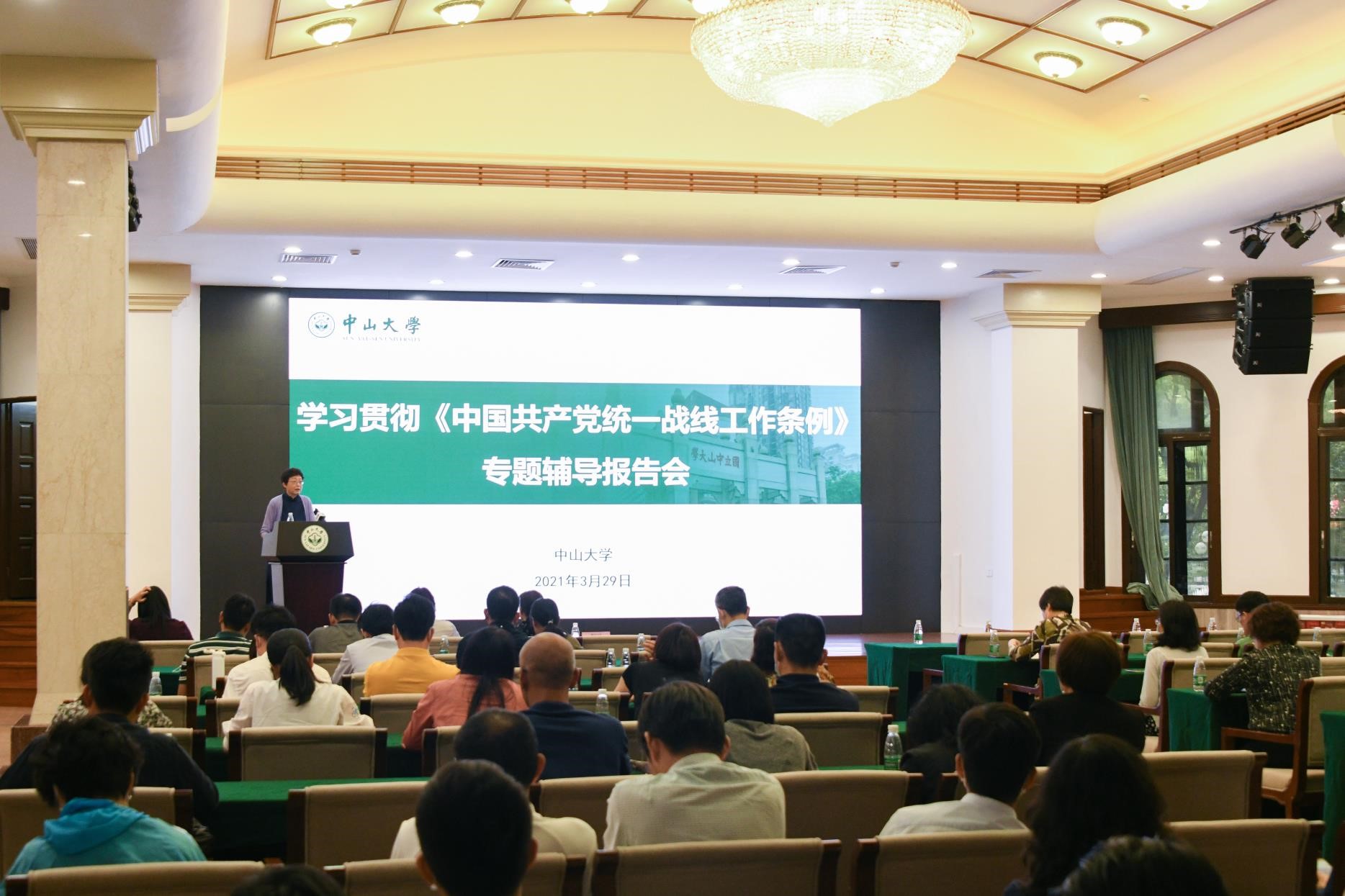 中大新闻网3月31日电(通讯员 何婉文)为深入学习宣传《中国共产党统一战线工作条例》(以下简称《条例》),全面准确学习领会党的统一战线理论方针政策,提高统战意识,确保《条例》各项规定得到贯彻落实,3月29日下午,党委统战部、党委宣传部联合举办学习贯彻《条例》专题辅导报告会,邀请广东省社会主义学院原党组成员、副院长肖莉教授作题为《学习贯彻< 条例>精神,推进统一战线事业发展》的辅导报告。学校统一战线工作领导小组、民族宗教工作领导小组成员单位负责人、工作人员,二级党组织书记、统战委员,各级人大代表、政协委员、政府参事、文史馆馆员,学校民主党派省直基层组织、侨联、知联会领导班子成员和骨干等在广州校区南校园主会场和珠海校区、深圳校区视频分会场参加会议。报告会由学校党委副书记、统战部部长国亚萍主持。