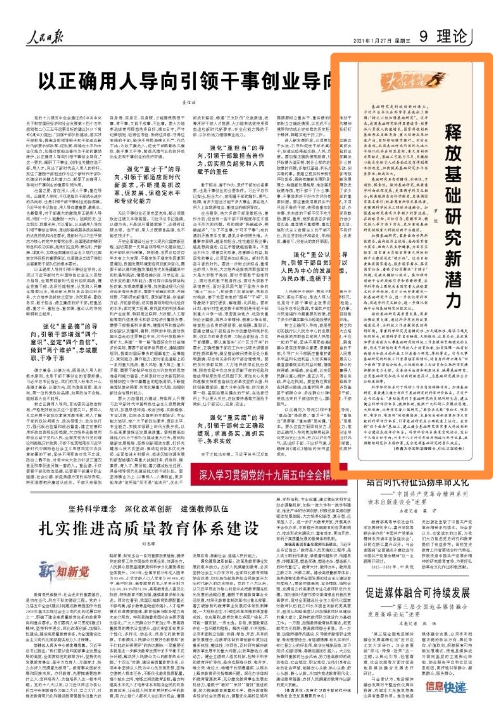 中大新闻网广州1月28日电(记者吴立坚)2021年1月27日出版的《人民日报》理论版刊发了罗俊校长文章《释放基础研究新潜力》。文章认为,尽管近年来我国基础研究取得显著进步,国际影响稳步提升,但是我国基础研究同国际先进水平相比还存在明显差距,重大原创性成果缺乏,关键核心技术受制于人的局面还没有得到根本性改变,需要加快提高基础研究水平。罗俊校长建议,通过重大科技创新平台建设、优化学科布局、促进学科交叉融合、加强政策支撑、健全科学评价体系等措施,释放基础研究新潜力。