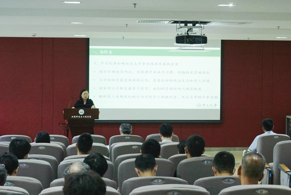 中大新闻网讯(通讯员金凤)10月12日下午,环境科学与工程学院在广州校区东校园环境大楼召开全院教职工大会,开展“师德建设主题月”及“纪律教育学习月”活动。大会邀请了学校纪委副书记、纪委办公室主任、监察处处长吴长征,党委教师工作部部长罗燕为教职员工作纪律教育及师德建设专题学习辅导报告。会议由学院党委书记甘远璠主持,全院教职员工及生态学院教师代表近百人参加会议。
