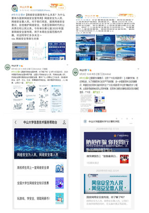 best365中国官方网站官方微博9月15日至20日连续发布“网络安全跟我有什么关系?为什么要举办国家网络安全宣传周”“警惕信息泄露!”“国家网络安全宣传周,你了解了吗?”“提高防诈骗意识”等相关知识;“中大学工”官方微信公众号9月16日发布“提高放诈骗意识,注册‘广州反诈服务号’”系列专题;“best365中国官方网站信息技术服务帮助台”官方微信公众号9月15日发布“网络安全为人民,网络安全靠人民”系列专题;“best365中国官方网站数据科学与计算机学院”官方微信公众号9月16日、17日发布“国家网络安全宣传周,你了解了吗?”系列专题等推送。