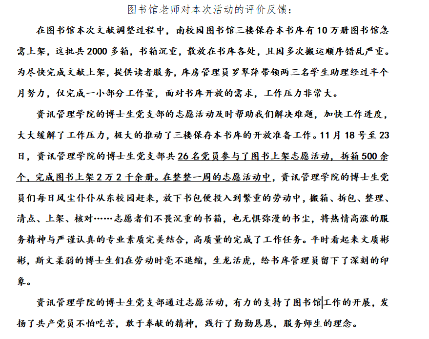 2019年11月18日-22日,支部组织党员开展志愿服务活动,经了解,南校园图书馆书库急需志愿者。但是,书库无法一次容纳近30人同时工作,大家又缺乏相关经验,仅服务1天,会给馆员造成培训和质检压力,易出现错漏,无实际帮助,却添了麻烦。为此,支部把任务分配安排了连续一个星期,分组进行,每时段3人,每人至少3个公益小时。出发前微信群线上打卡,完成后线上分享经验,责任接力,分工配合。这次志愿活动共26人参与,完成图书上架22000余册,得到了图书馆老师们的极高肯定,鼓舞了支部党员积极服务师生的士气。
