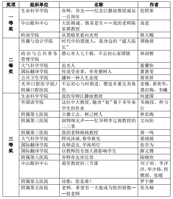 袁进介绍中山眼科中心老院长陈家祺教授的《大医精诚 情系苍生》和伦照荣纪念生命科学学院刚刚过世的百岁恩师江静波教授的《亦师,亦友》两篇文章,同时获得广东省征文一等奖;韩天赐描写岭南学院夏南新教授教学研究日常的《春风化雨,我心光明》获二等奖。