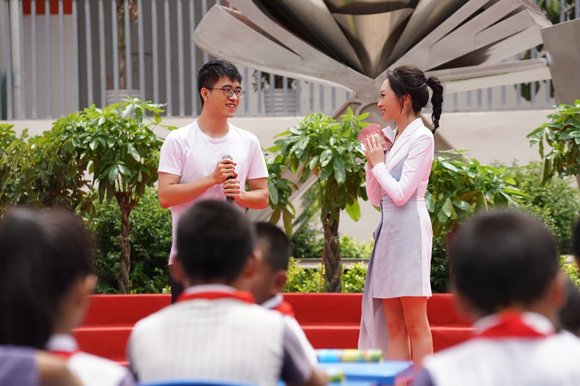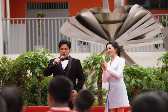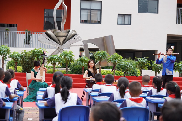 在音乐公开课上,艺术学院师生进行了专业的艺术展示,并与思源小学的同学们进行了教学互动。金婷婷副院长、张海庆副教授在现场一展歌喉,为同学们示范了民族、美声、流行等多种声乐唱法,悠扬的歌声久久回荡在校园,也将音乐的种子播撒在他们的心田。李燕副书记现场讲授藏族、蒙古族、傣族舞蹈动作,让同学们感受我国丰富多彩的民族艺术。胡妍璐、崔杉、陈柏安老师带领同学们认识琵琶、古筝、竹笛等中国传统乐器,并合奏一曲,泠泠的琴音和悠悠的笛声令人陶醉其中。此外,彭建楠博士讲述了彝族童谣的来历,光辉、陈孟璋还邀请同学们进行了绘画创作,用五彩斑斓的颜料来勾画他们心中的童话世界。