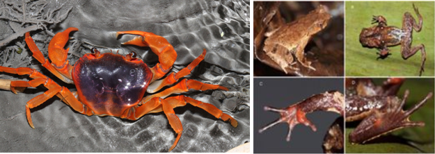 本科生发现的新物种灰岩粤北溪蟹、封开角蟾、黑石顶角蟾(来源:生命科学学院)
