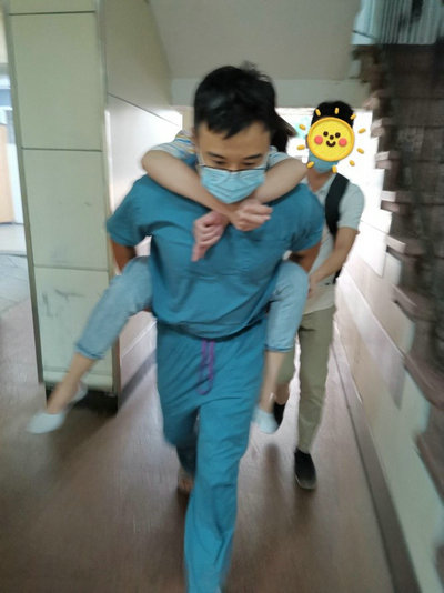 胡旭民医生背着秦女士前往急诊的路上(图片来源:孙逸仙纪念医院)