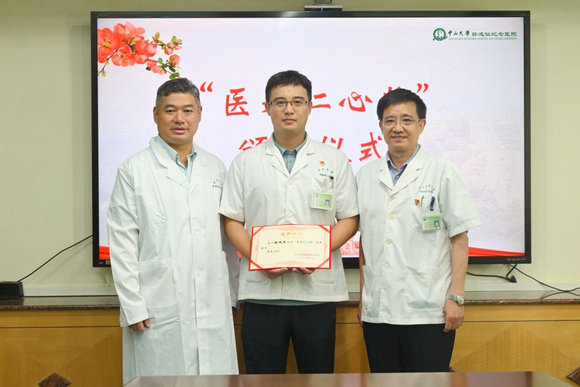 宋尔卫院长、王景峰书记为胡旭民医生颁发“医者仁心奖”(图片来源:孙逸仙纪念医院)