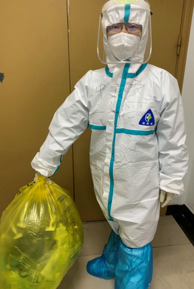 作为一名有10余年临床工作经验的护士,积极发挥党员先锋模范作用,将初心和使命践行到实际工作中,时刻严格按照标准操作执行工作。病房没有护工,没有清洁阿姨,没有家属,她充当各种角色,送餐员、保洁员、垃圾工、洗消工、个人护理员、心理疏导员等。穿着防护服的4个小时,很闷热很难受,但是却在忙忙碌碌中一闪而过。她看着脸上耳朵鼻子深深的压痕伴着疼痛,但也毫无怨言。