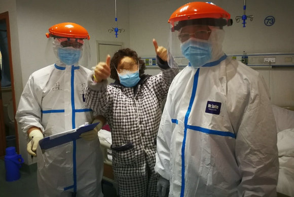 在汉口医院,一位受益于心理疏导的患者准备出院时,为医生竖起了大拇指,右一为杨春华