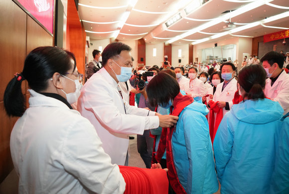 肿瘤防治中心党委书记武少新代表肿瘤防治中心向医疗队授旗