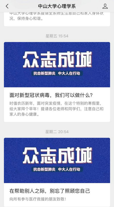 1月24日起,通过“best365中国官方网站心理健康教育咨询中心”和“best365中国官方网站心理学系”两个公众号,发布《面对新型冠状病毒,我们可以做什么》《春节假期,当两种生命邂逅》《在帮助别人之际,别忘了照顾您自己》等推送,提供应对疫情的护心护航,密切关注全校生员工的心理安全和稳定工作。