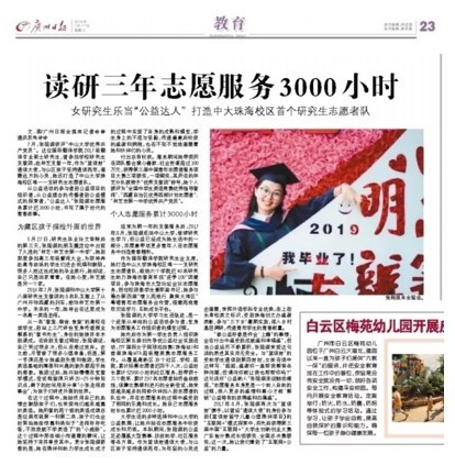 她先后作为第一学生负责人组织珠海校区第五届创先争优公益社会实践活动,ITF国际女子网球巡回赛(珠海站)和首届珠海WTA超级精英赛志愿服务工作,从覆盖高新区39个社区、学校、医院,累计招募志愿者近四千人次,公益时长累计52000小时的社区服务,到带领十三个院系、累计297名志愿者参与并保障比赛顺利进行的全新尝试,她发现越来越多的同龄伙伴加入到志愿者的队伍中,并在志愿服务的过程中感受到了相同的乐趣和成长。她本人志愿服务时长也累计近3000小时。