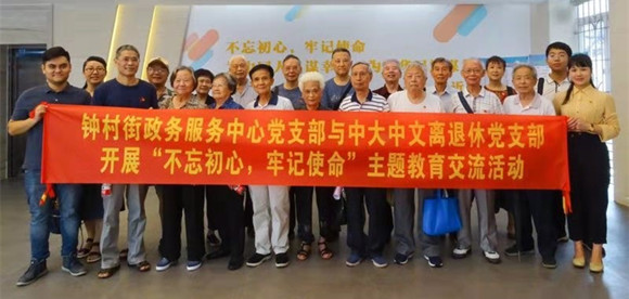 10月22日,中文系离退休党支部与钟村街道办政务服务中心共同开展推进主题教育交流活动。