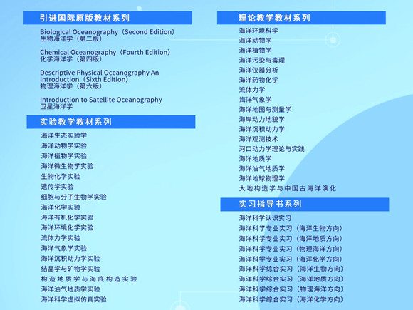 即将出版的教材共14本,分别为:《海洋植物学》《海洋油气地质学》《海岸动力地貌学》《生物海洋学(第二版)》《海洋生态学实验》《遗传学实验》《海洋地图与测量学》《流体力学》《海洋污染与毒理》《海洋地质学》《化学专业英语(海洋化学方向)》《海洋科学认识实习》《海洋科学专业实习(物理海洋方向)》《海洋科学综合实习(物理海洋方向)》。