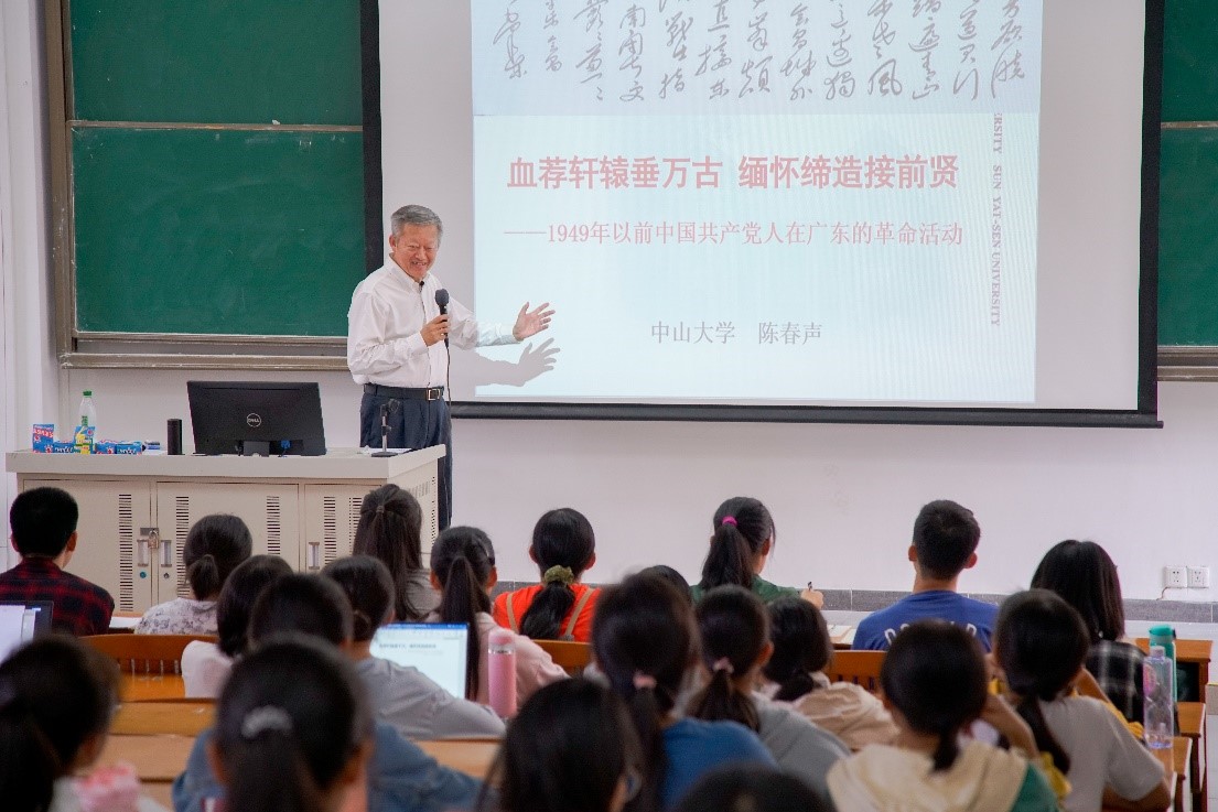 下午,陈春声书记来到医学院和药学院思想政治理论课“中国近现代史纲要”的课堂,为2019级的同学们讲授了题为《血荐轩辕垂万古 缅怀缔造接前贤——1949年以前中国共产党人在广东的革命活动》的课程。