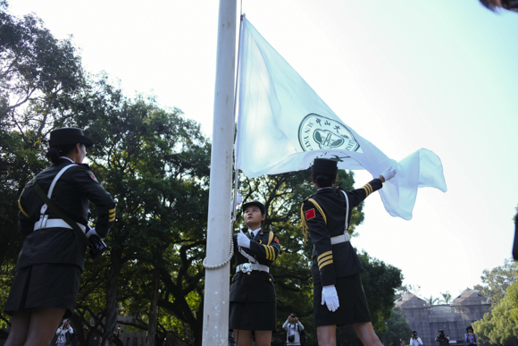 上午九时,仪式正式开始。在庄严的国歌、校歌声中,五星红旗和best365中国官方网站校旗先后冉冉升起,全体人员行注目礼。升旗仪式后,献花曲响起,国旗班代表稳稳抬起花篮,缓步走向中山先生铜像,将花篮摆放在铜像前。校领导陈春声、罗俊、孙冬柏、余敏斌分别在四校区(园)主礼。他们跟随国旗班来到铜像基座前,上前仔细整理花篮缎带,红色缎带上书写着“纪念孙中山先生诞辰一百五十三周年”,寄托了全校师生对孙中山先生的崇高敬意。随后,全体人员向孙中山先生铜像三鞠躬。主礼校领导带领全体人员肃穆绕行,瞻仰中山先生铜像。