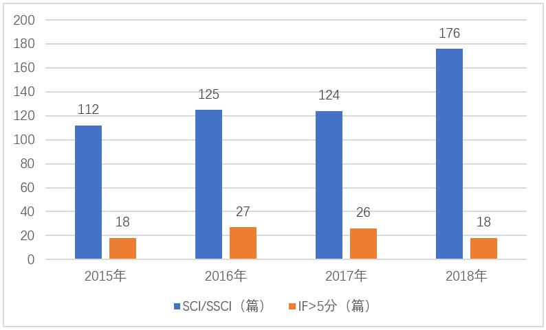 2016-2018年间,学院发表SCI论文数和高水平论文(IF>5分)均呈现增量趋势(见图2)。