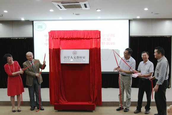 社会学与人类学学院院长张应强(右三)、党委书记侯志红(左一),中山医学院党委书记吴忠道(左二)、副院长高国全(右二),中山医学院医学人文教研室主任程瑜(右一)共同为医学人文学教研室揭牌