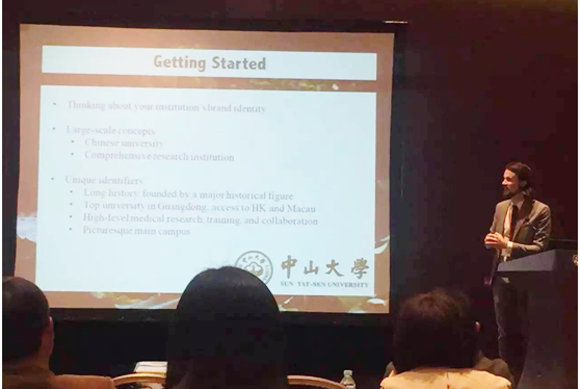 Ian Heuer介绍了我校的概况,讲解了中大如何通过网络在全球范围内进行学校的推广宣传。Ian Heuer演讲突出了“内容”和“平台”两个关键词,他指出,宣传推广很重要的几点是加强品牌标识、有针对性地选择宣传内容及开拓合适的宣传平台。在演讲中,他讨论了高校内部各部门之间协调配合的重要性。