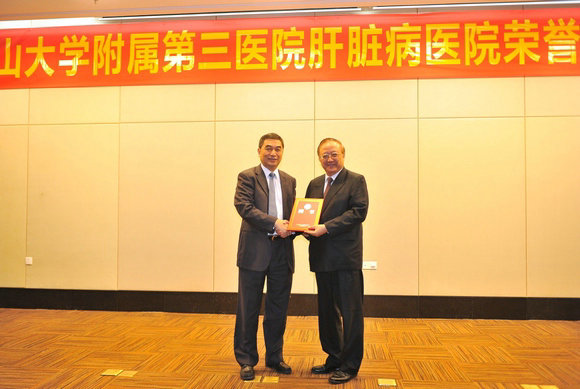 附属第三医院院长陈规划(左)代表医院为刘允怡院士(右)颁发聘任证书